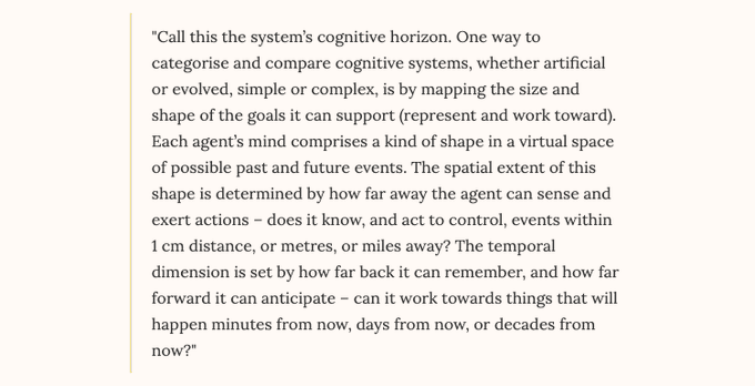 Moving from individuals to everything from single-celled organisms to super-organisms like ant colonies, cognitive horizons refers to the ‘spatiotemporal dimensions of the goals a system can represent and work towards.’ Levin & Dennett: