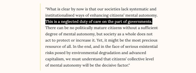 But we have a tendency to think of skills-training as an individual affair. Not so for mental autonomy. Metzinger: