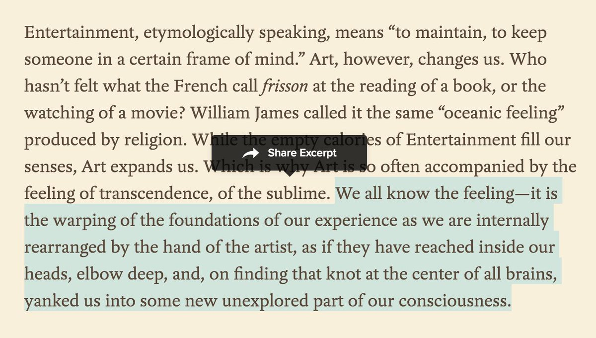 This might be the best essay I’ve read in recent memory. It’s got me all jazzed up, tingling & alive. I wrote an excited Twitter thread about it. I don’t know how to say what it’s about without being reductive. Like any great essay, it meanders through disparate themes, different rooms of human experience, but winds up in a place that brings them all together.