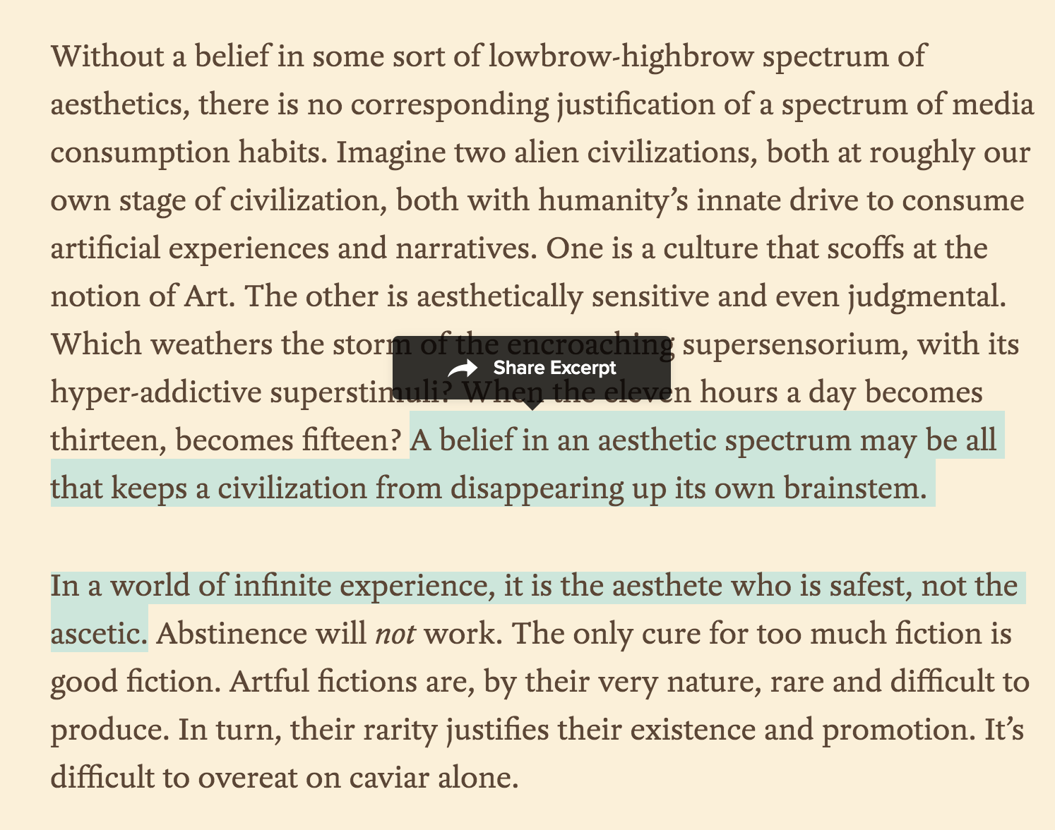 Hoel goes on to suggest that in a world of infinite experience, taste - a cultivated sense of aesthetics, or a skillful-means approach to media consumption (and media is eating the world, soon everything might become media, if it isn’t already) - may be “all that keeps a civilization from disappearing up its own brainstem”: