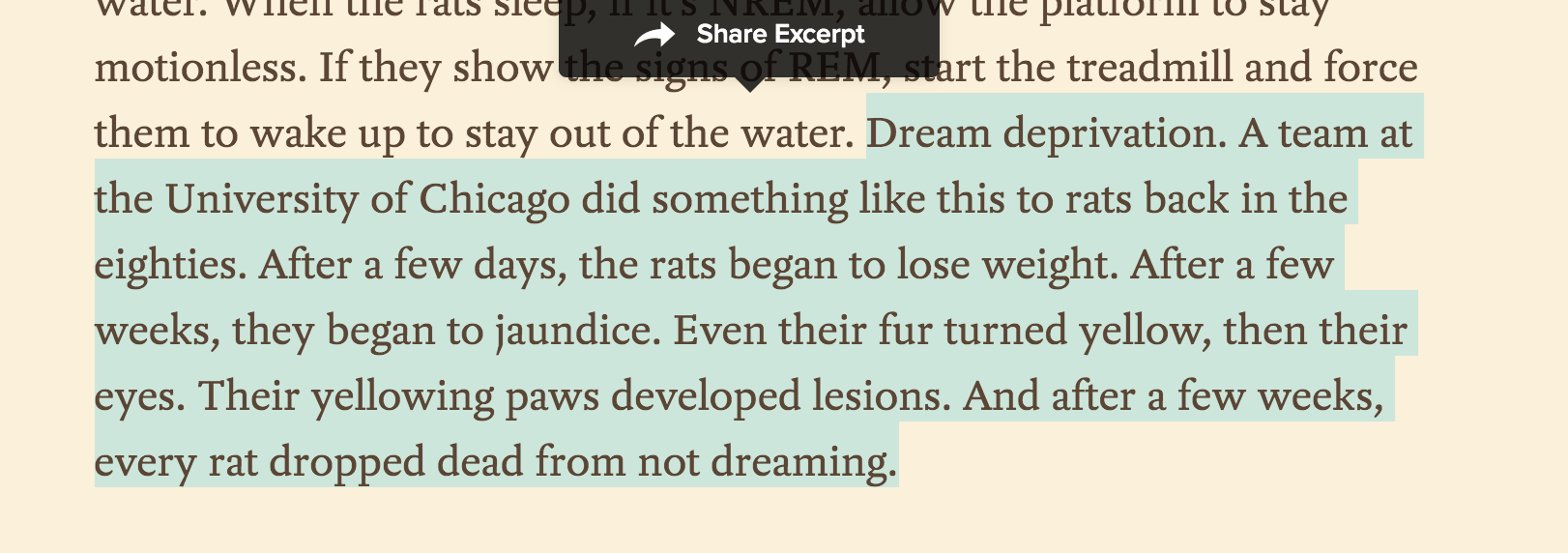Lots going on. Let’s begin with this: in the 80’s, a group of researchers at University of Chicago deprived rats of dreams, and they all died. The rats. Not from sleep deprivation, but dream deprivation.